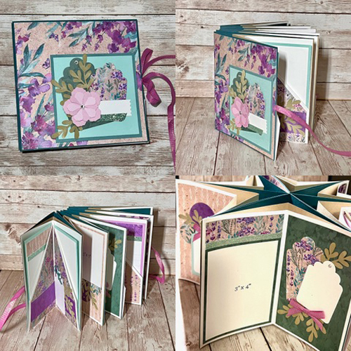 Create this gorgeous multi page Star Album with its interactive photo mats, journalling areas and mini pockets. It’s the perfect way to showcase your photos. With a finished size of 5.5” x 5.5” x 2” it also makes an ideal gift. The shades of lavender and teal along with the delicate die cut leaves and flowers are sure to complement your favorite pictures. Full step by step photo instructions included.